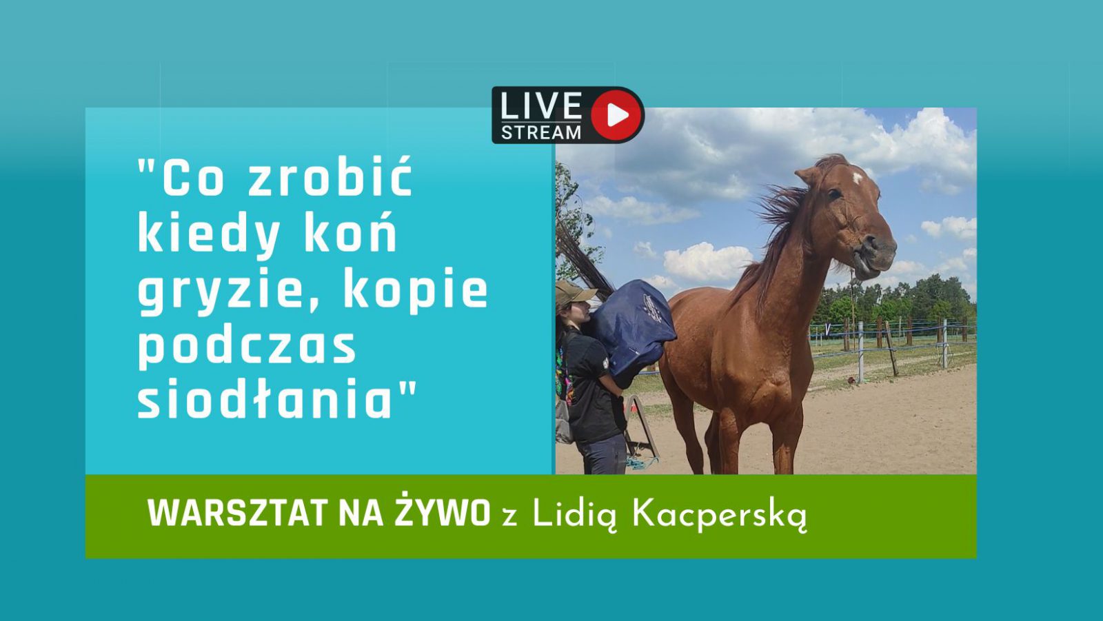 re Transmisja z treningu na żywo z koniem który szczurzy się, gryzie, kopie w trakcie siodłania. Wszystko odbyło się czasie rzeczywistym. To nie jest webinar, a transmisja internetowa na której pokazana została praca z koniem w zaproponowanym temacie. Serdecznie Was zapraszamy do uczestnictwa w wydarzeniu